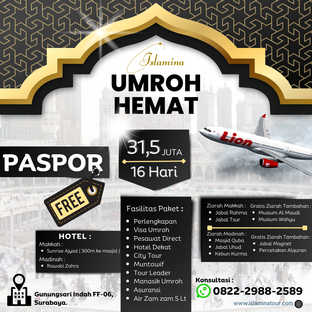 Sebagai travel umroh terpercaya, kami memberikan harga terbaik dan terjangkau untuk para calon jamaah sesuai dengan visi Islamina Tour yaitu memudahkan setiap muslimin dan muslimah untuk beribadah ke tanah suci. Kami didukung tim yang profesional dan berpengalaman, fasilitas akomodasi yang nyaman, dan penanganan penuh perhatian, tentunya anda tidak akan kecewa dengan pelayanan yang kami berikan. Mari bersama-sama menjalani perjalanan suci menuju Baitullah.